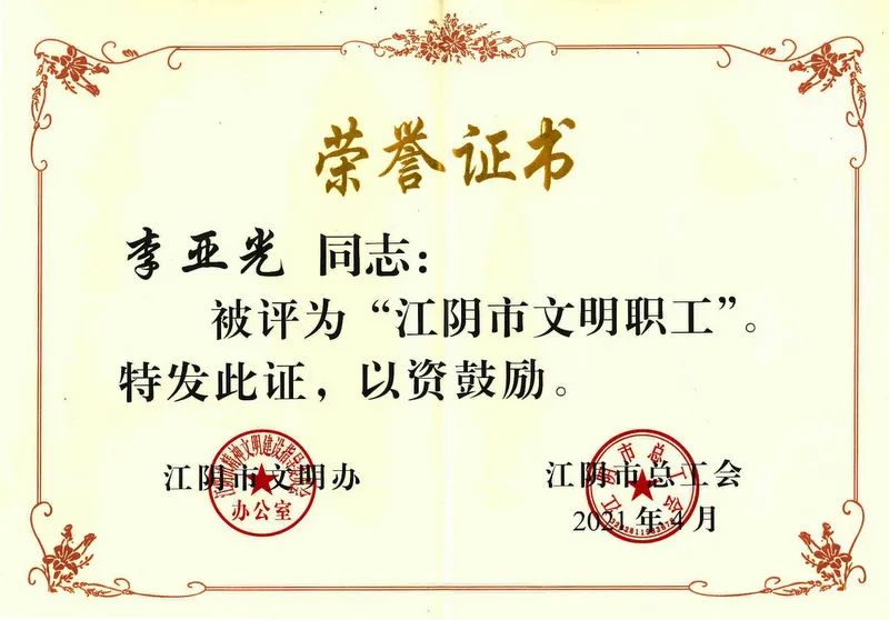 21年春,由江陰市精神文明建設指導委員會(huì )辦公室, 江陰市總工會(huì )聯(lián)合發(fā)起的評選中,江蘇雙良鍋爐有限公司李亞光獲評“江陰市文明職工”。這不是他第一次獲獎,1998年至2008年連續11年被評為“公司先進(jìn)工作者”,2010年被評為“利港鎮先進(jìn)工作者”、“集團能源管理先進(jìn)工作者”,2014年被評為“集團十佳員工”,2015年被評為“江陰市優(yōu)秀職工”,“空氣壓縮機管路改進(jìn)”獲評“臨港經(jīng)濟開(kāi)發(fā)區合理化建議一等獎”,2016年被評為“無(wú)錫市五一創(chuàng )新能手”;2017年液壓U型管水壓工裝獲評雙良集團2016年度十大合理化建議獎,2018年獲評2017年度利港工匠,液壓U型管水壓工裝獲評利港科技之星。